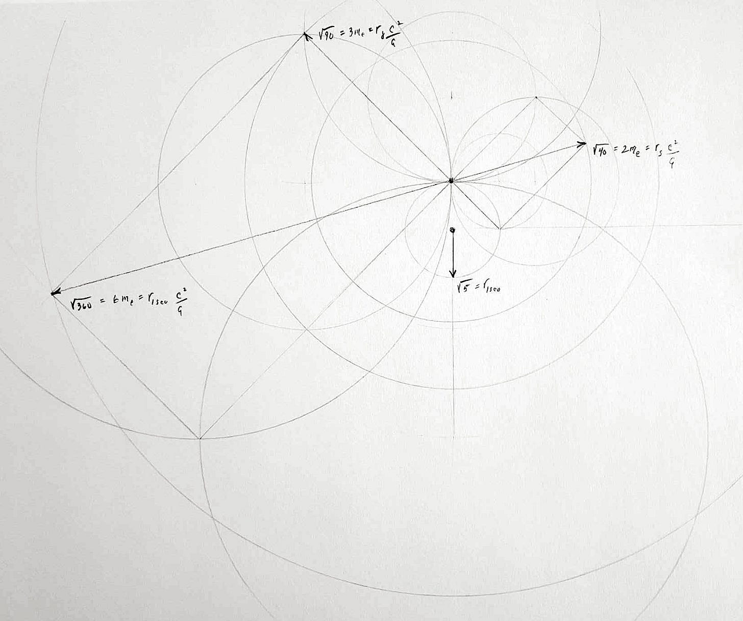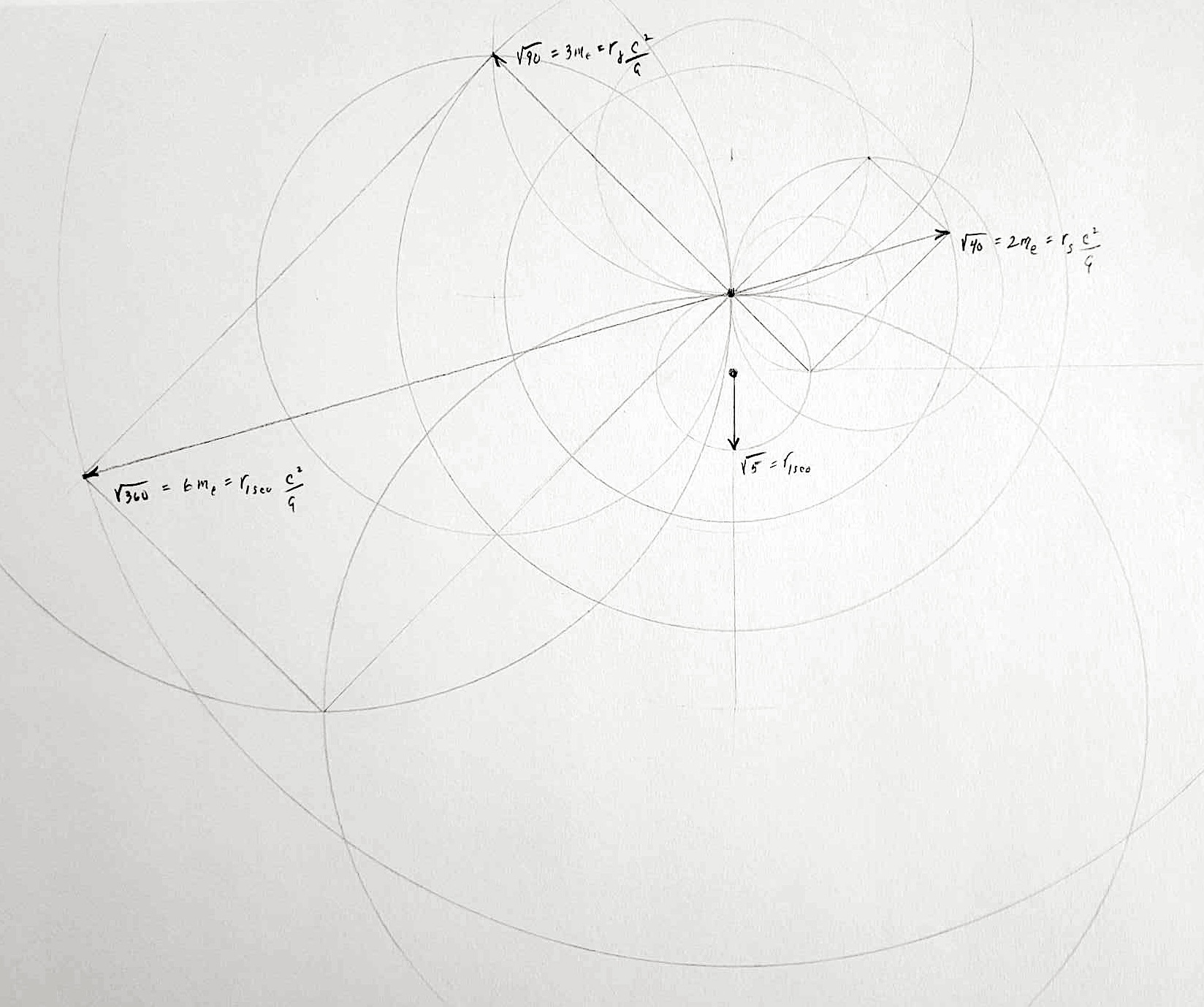 the thought is that the self-similarity inherent in the golden ratio at all scales — as above, so below — is what lends to this pattern arising from the noise to become the standing wave that is the manifest universe. not to mention, this seems to suggest a direct relationship between the curvature of space relative to any mass, and the speed of light is the same in all frames, so please consider it a challenge to adapt einstein’s field equations to this model :) in fact, please take it further and prove the fundamental relationship between the speed of light and the innermost stable circular orbiting radius around the one true black hole. our starting point, as it were.
